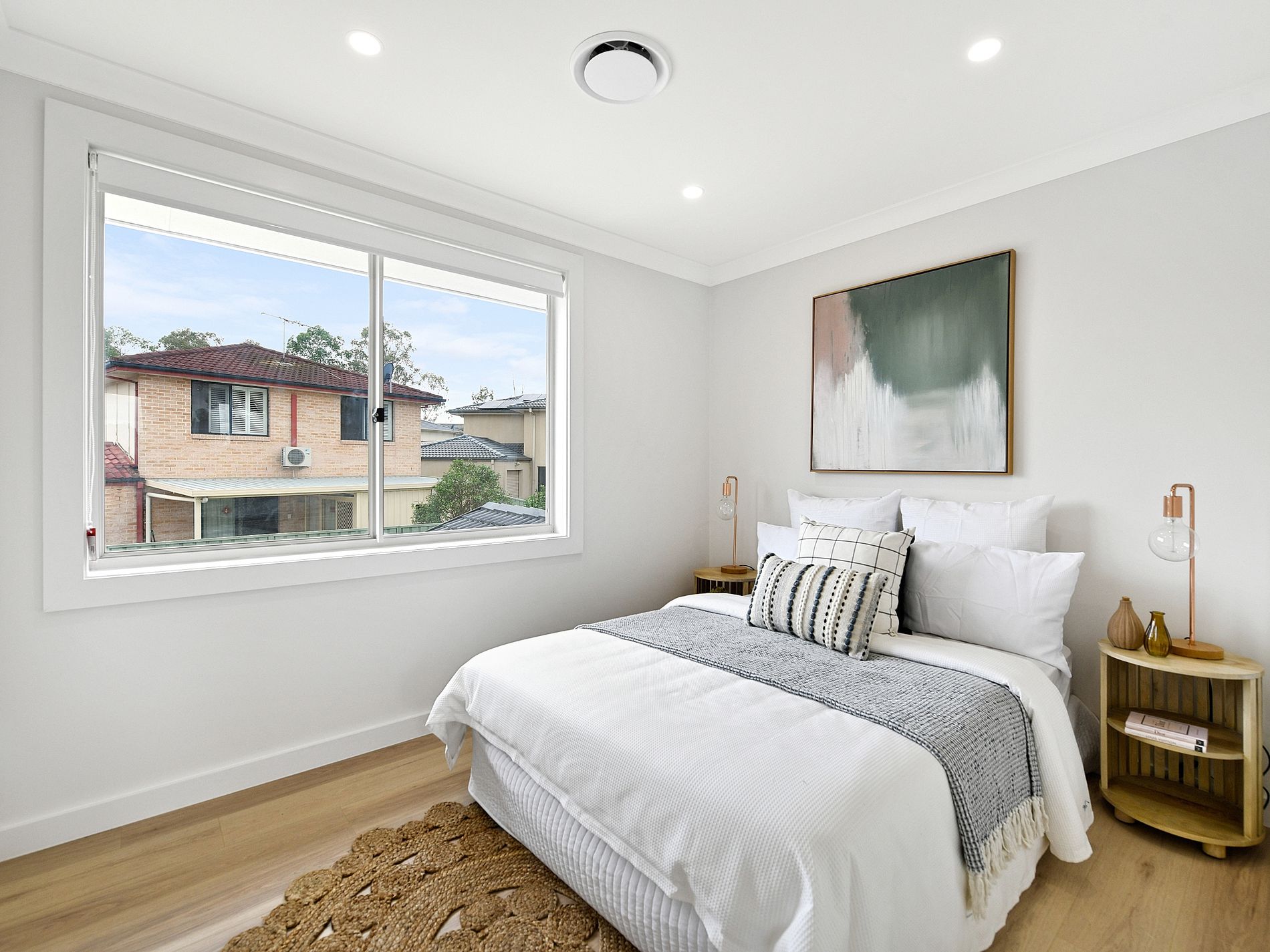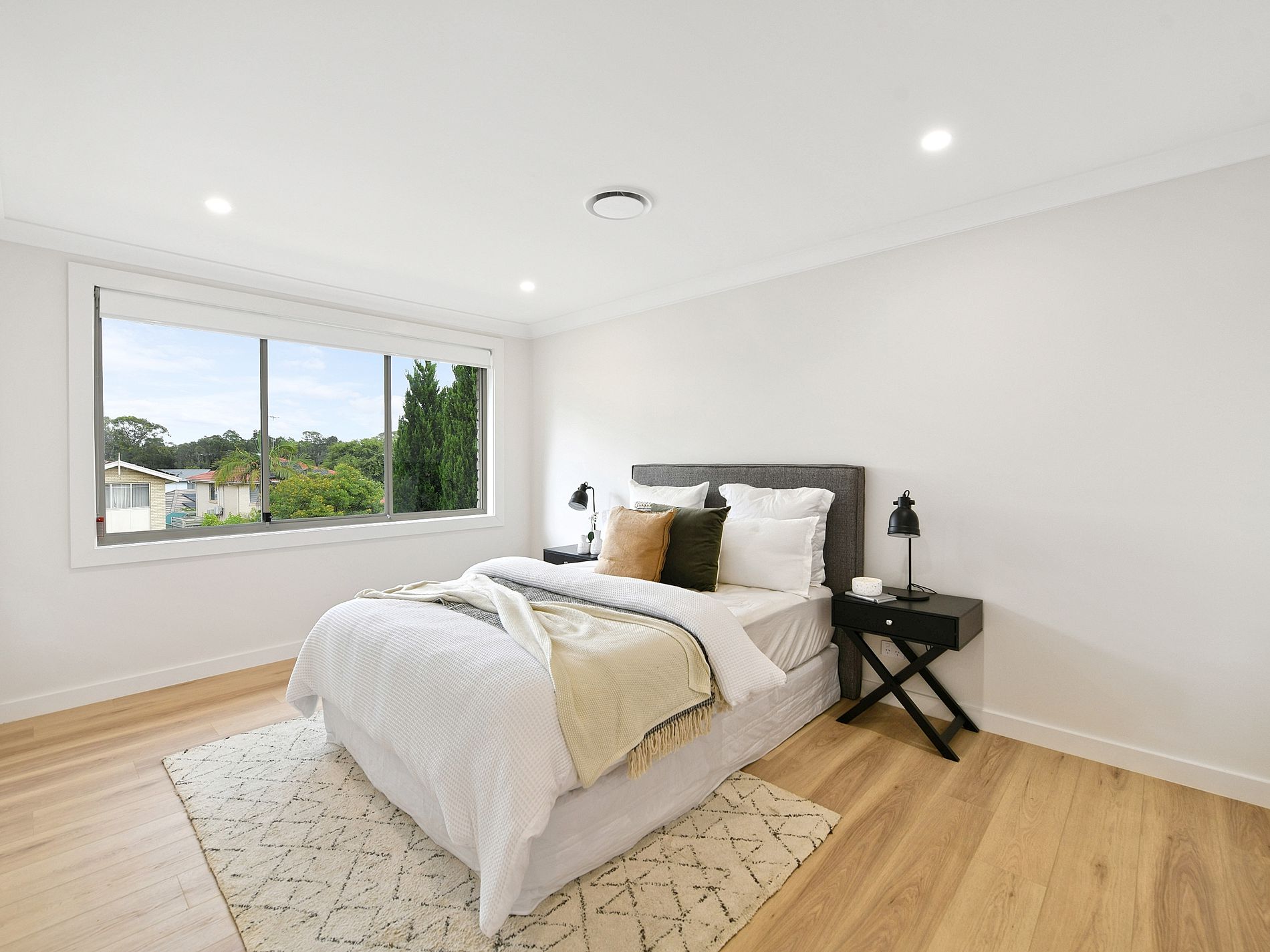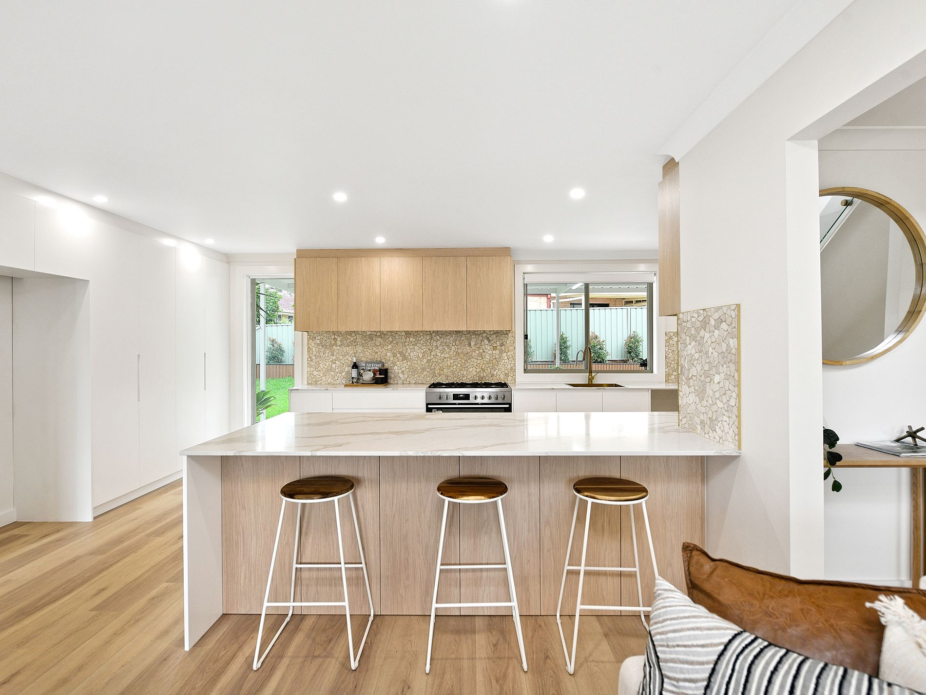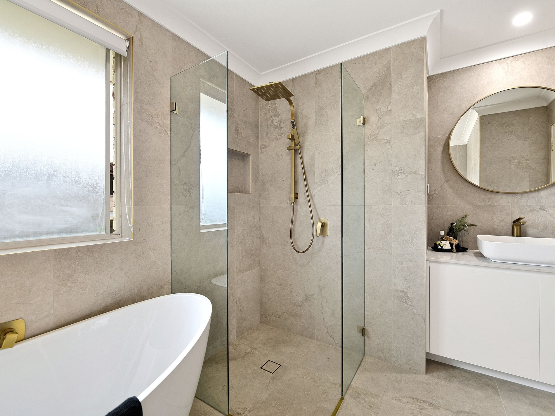 Upstairs features 4 bedrooms and 2 bathrooms. Master with en-suite and walk in robe. Designer bathrooms with gold colored fittings, frameless shower screens and island bath tub to the main.